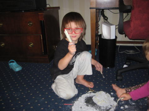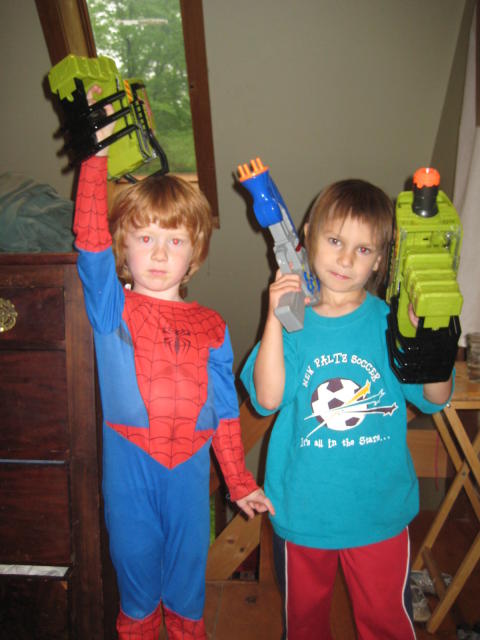 One day Declan created a store upstairs. He sold all kinds of stuff, for “real money, Mom.” He kept saying, “Thank you for shopping at Shop Rite. May I help you carry your things to your car?” Quinny helped out at the register.